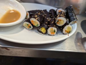 キンパと麺のような料理を買って屋台で座って食べることができました。